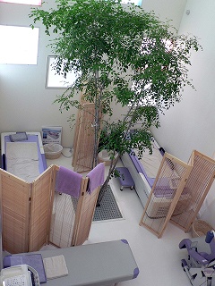 【新棟・待合スペース】 新棟は平成20年3月より稼動し、理学療法スペース、検査室、点滴室、栄養指導室、会議室を設置してあります。 吹き抜けで白を基調にしたとても明るい建物で、ほぼ中央に待合スペースがあります。 |